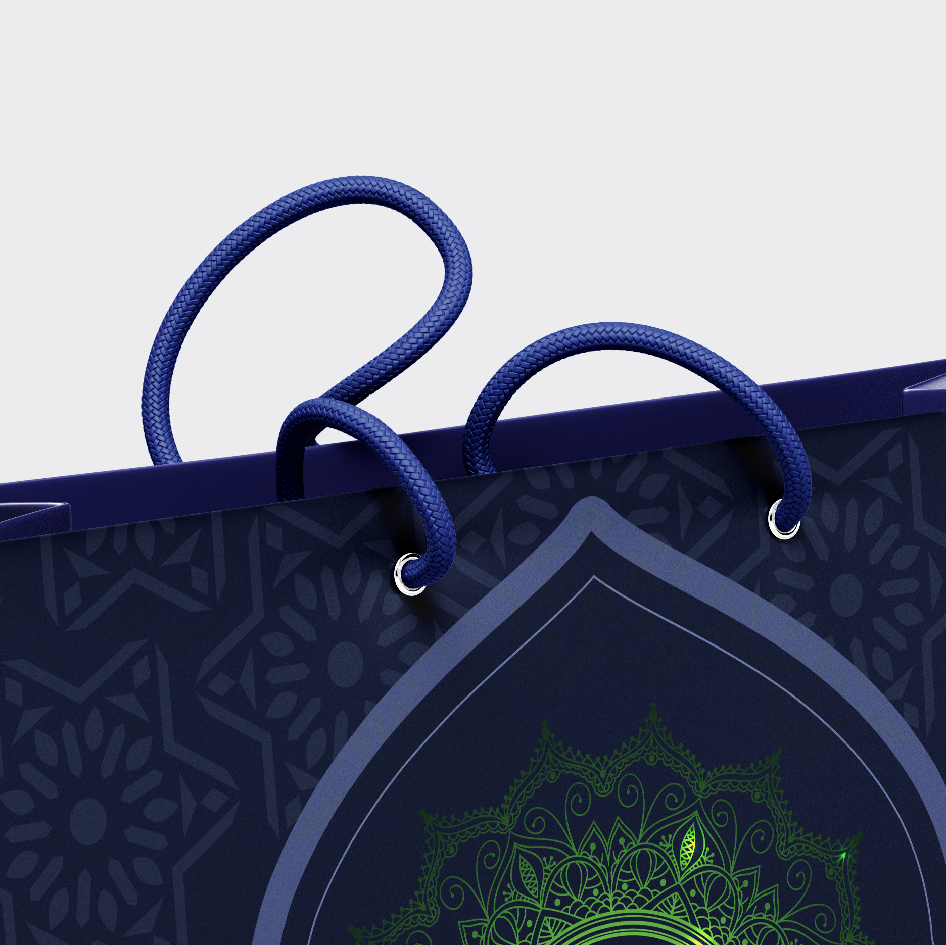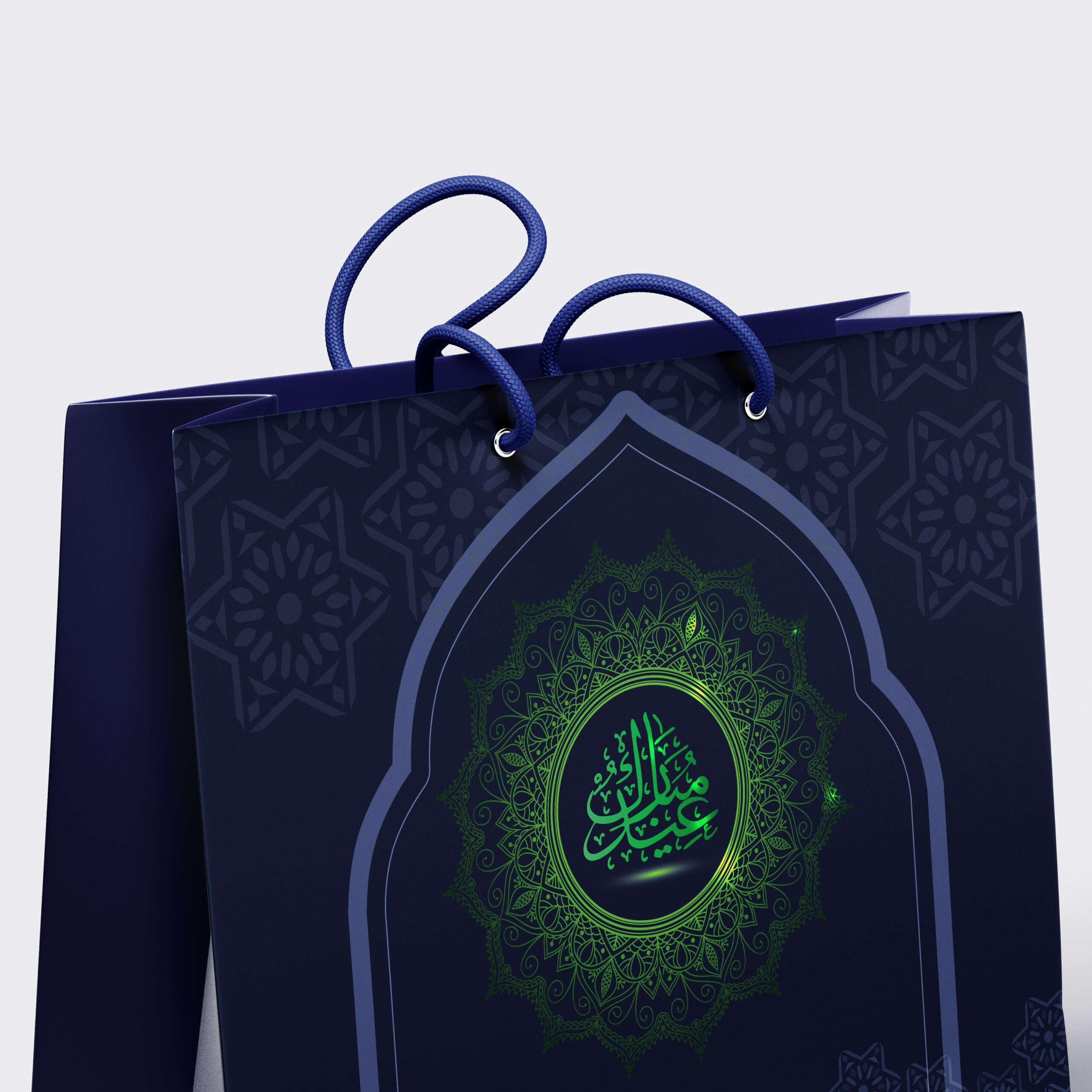 গভীর নীল রঙের রাজকীয় আবহ, সূক্ষ্ম ইসলামিক মোটিফ আর মাঝখানে উজ্জ্বল সবুজ ক্যালিগ্রাফি—এই শপিং ব্যাগটি শুধু প্যাকেজিং নয়, এটি রুচি, বিশ্বাস ও আভিজাত্যের প্রতীক। উপহার হোক বা ব্র্যান্ড প্রেজেন্টেশন, প্রতিটি মুহূর্তকে করে তোলে আরও মর্যাদাপূর্ণ ও স্মরণীয়।